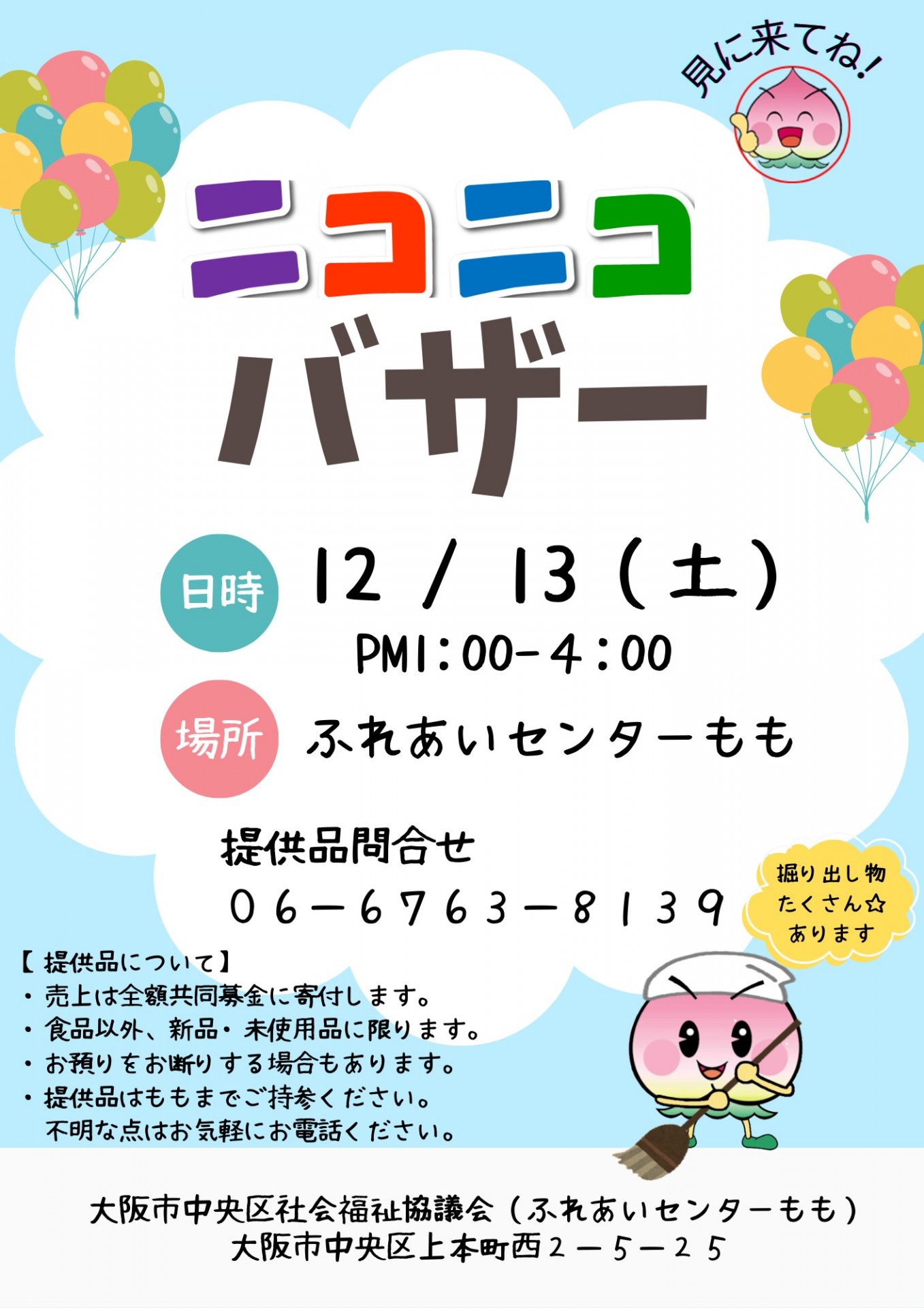 2026.01.14ニコニコバザーニコニコバザー令和7年12月13日(土)にふれあいセンターももでニコニコバザーを開催したところ、 多くの方にご来場いただき大盛況でした。 当日の売上げは、合計77,137円となり、全額中央地区募金会に 寄付させていただきました。 バザーへの出品、購入等、ご協力いただきありがとうございました。