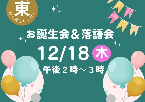 場所:中央区東老人福祉センター内容:参加者紹介・写真撮影・落語定員:25名(要申込・先着順)※落語はお誕生月以外の方でも若干名ご参加いただけます。詳しくは事務所までお問合せください。...