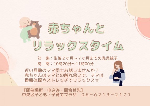 助産師さんを交えて、近い月齢のママ同士お話しませんか?赤ちゃんはママとの触れ合いで、ママは骨盤体操やストレッチでリラックスしましょう☆詳細はコチラ☆【開催場所・問合せ先】中央区子ども・子育てプラザ06-6213-2171...