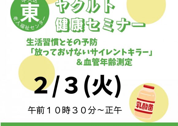 場 所:中央区東老人福祉センター内 容: 生活習慣とその予防 放っておけないサイレントキラー「血管年齢測定」定 員:30名(要申込・抽選)申込締切日:1月27日(火)※1月28日(水)午後1時以降にLINE・窓口にて当選者の発表を行います。各自抽選番号をご確認ください。なお、お電...