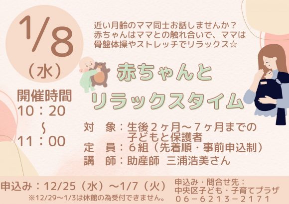 場 所:中央区南老人福祉センター講 師:森永 裕美さん定 員:25名(要申込・抽選)申込締切日:12月26日(木)参加費:無料※抽選の上、当選者の方に電話連絡をします。※申込み・問合せについては06-6213-2172中央区南老人福祉センターまで...