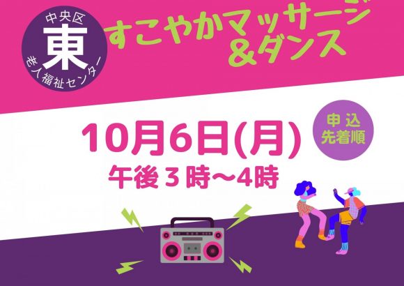 場 所:中央区東老人福祉センター内 容:リンパマッサージを含む簡単なマッサージ&ダンス定 員:40名(要申込・先着順)参加費:無料...