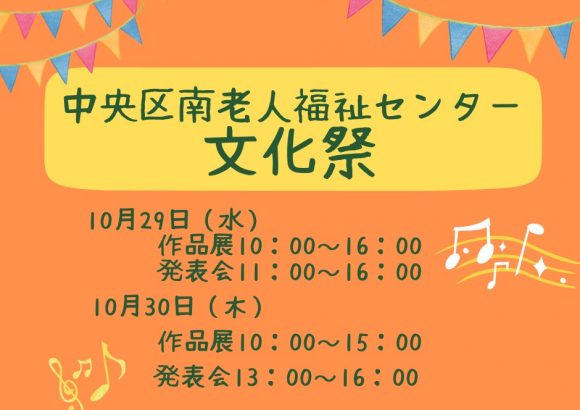 皆さんの日頃の活動の成果を披露する展示会と発表会です!ぜひ、お誘いあわせのうえ、お気軽にお越しください。作品展:午前10時~午後4時発表会:午前11時~午後4時場所:中央区南老人福祉センター問合せについては06-6213-2172中央区南老人福祉センターまで...