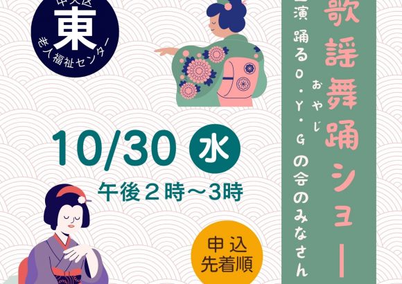 2025.10.30歌謡舞踊ショー場所:中央区東老人福祉センター内容:歌謡曲を楽しみながら、脳を活性化させましょう♪健康づくりの体操もあります!出演:踊るO・Y・G(おやじの会)定員:40名(要申込・先着順)...続きを読む