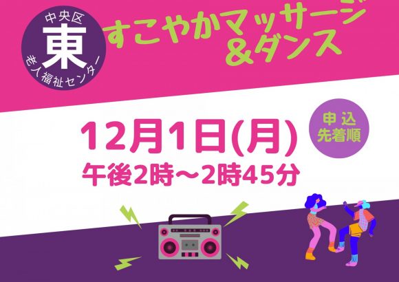場 所:中央区東老人福祉センター内 容:リンパマッサージを含む簡単なマッサージ&ダンス定 員:40名(要申込・先着順)参加費:無料...