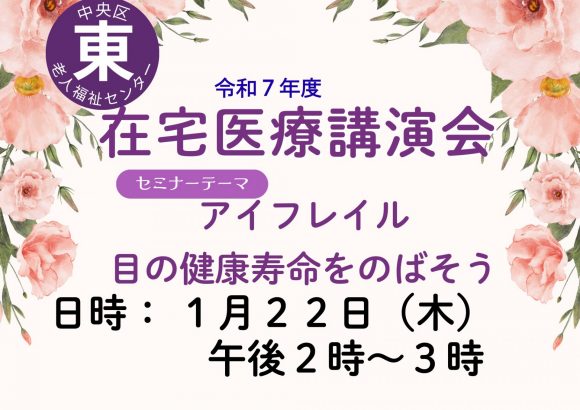 場所:中央区東老人福祉センター内容:「アイフレイル 目の健康寿命をのばそう」講師:森ノ宮なかがわ眼科 中川 聡子 先生定員:40名(要申込・先着順)...