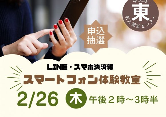 場 所:中央区東老人福祉センター内 容:LINE・スマホ決済編定 員:20名(要申込・抽選)申込締切日:2月19日(木)参加費:無料当選発表:2月20日(金)午後1時以降、LINE・窓口にて当選者の発表を行います。※センターからの電話連絡は致しません。※契約会社問わず、ど...