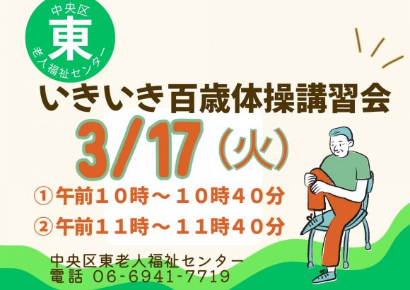 2026.03.17百歳体操講習会①午前10時~10時40分⓶午前11時~11時40分場所:中央区東老人福祉センター内容:百歳体操の指導対象者:いきいき百歳体操参加者、いきいき百歳体操をはじめてみたい方定員:各回35名(要申込・先着順)参加費:無料※申込み・問合せについては06-6941-7719 中...続きを読む