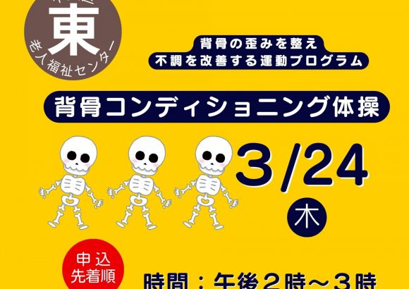 背骨の歪みを整え、不調を改善する運動プログラム場所:中央区東老人福祉センター内容:背骨コンディショニング体操定員:40名(要申込・先着順)...