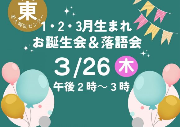 場所:中央区東老人福祉センター内容:参加者紹介・写真撮影・落語定員:25名(要申込・先着順)※落語はお誕生月以外の方でも若干名ご参加いただけます。詳しくは事務所までお問合せください。...