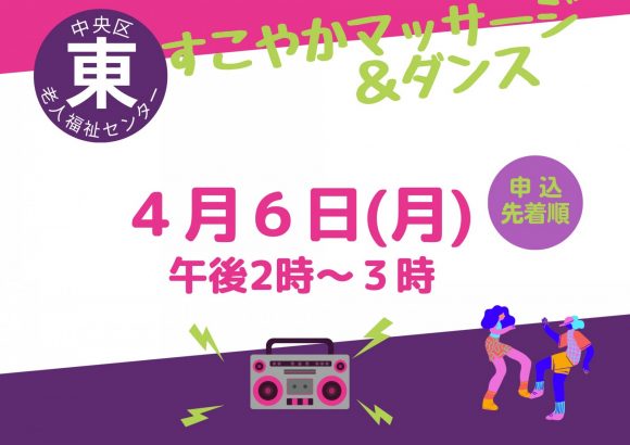 場 所:中央区東老人福祉センター内 容:リンパマッサージを含む簡単なマッサージ&ダンス定 員:40名(要申込・先着順)参加費:無料...