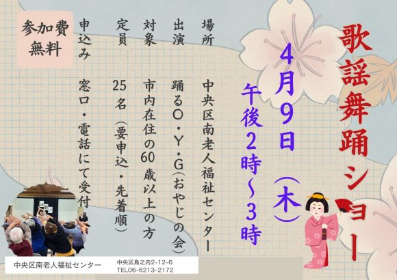 2026.04.09歌謡舞踊ショー場 所:中央区南老人福祉センター講 師:岡原 恵子 さん(主宰)踊るO・Y・G(おやじの会)定 員:25名(要申込・先着順)参加費:無料※申込み・問合せについては06-6213-2172中央区南老人福祉センターまで...続きを読む