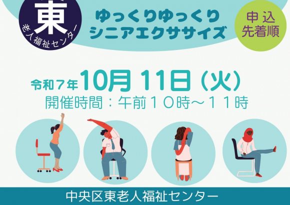 場 所:中央区南老人福祉センター講 師:健康の~びのび体操 加福 明子さん定 員:20名(要申込・抽選)申込締切:10月23日(木)参加費:無料持ち物:タオル、飲み物※必ずご持参お願いします。※抽選の上、当選者の方に電話連絡をします。※申込み・問合せについては06-6...